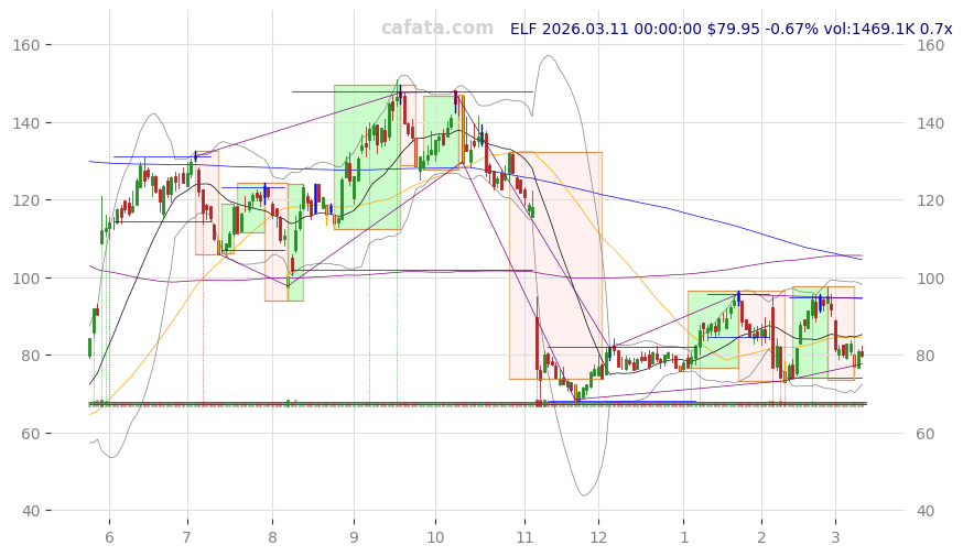 | ELF | 2026-03-11 | -1.14% | v | -6d | 15 | 1227.1k | -8.95% | 2017-02-09 | household & personal products | household & personal products |