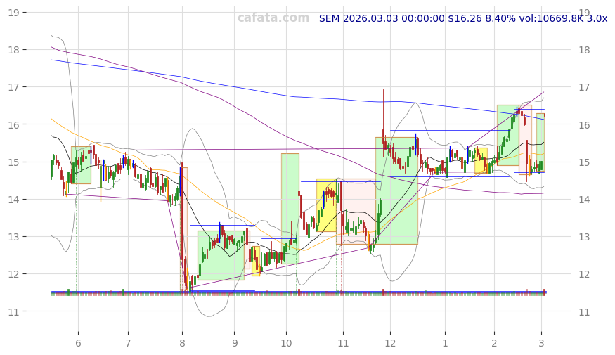 | SEM | 2026-03-04 | -0.09% | v | 2d | 1 | 201.4k | -12.10% | 2018-11-01 | medical care facilities | medical care facilities |
